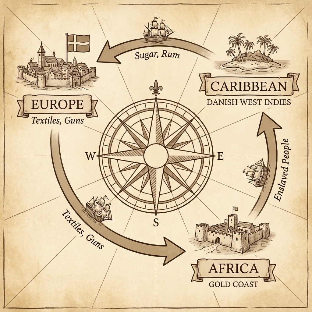 Trekantshandlen var grundlaget for Danmarks rigdom i kolonitiden. Skibe sejlede fra Danmark med våben og tekstiler til Afrika, hvor de købte slaver. Slaverne blev fragtet til Vestindien og solgt til plantageejere. Skibene vendte derefter hjem til Danmark lastet med sukker, rom og tobak.